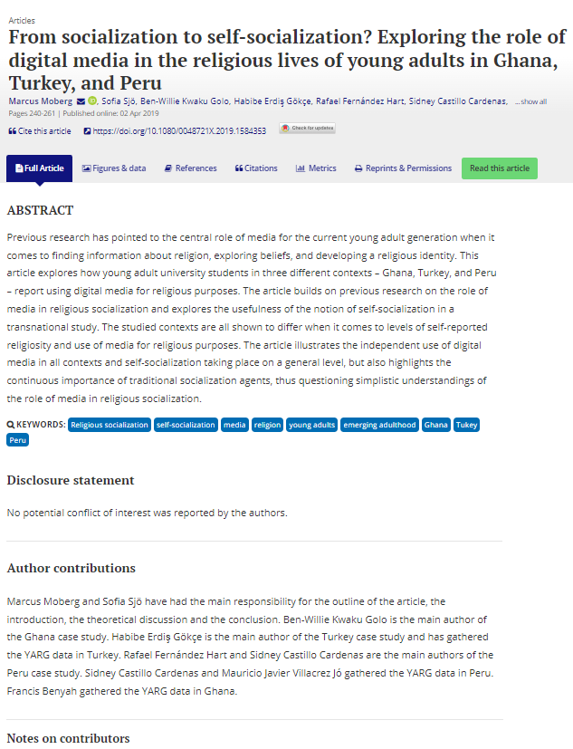 Moberg, M., Sjö, S., Golo, B. W. K., Erdiş Gökçe, H., Fernandez, R., Castillo, S., Benyah, F., & Villacrez, M. (2019). From socialization to self-socialization? Exploring the role of digital media in the religious lives of young adults in Ghana, Turkey, and Peru. Religion, 49(2), 240–261