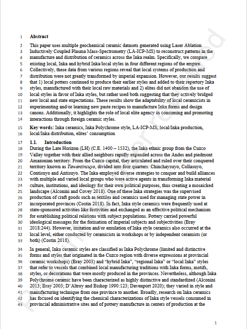 Chacaltana, S., Baca, E., Hernández, C., Norman, S. & Grávalos, E. (2023). Inka and Local ceramic production and distribution networks: A view from the Chinchaysuyo and Colesuyo. SSRN.